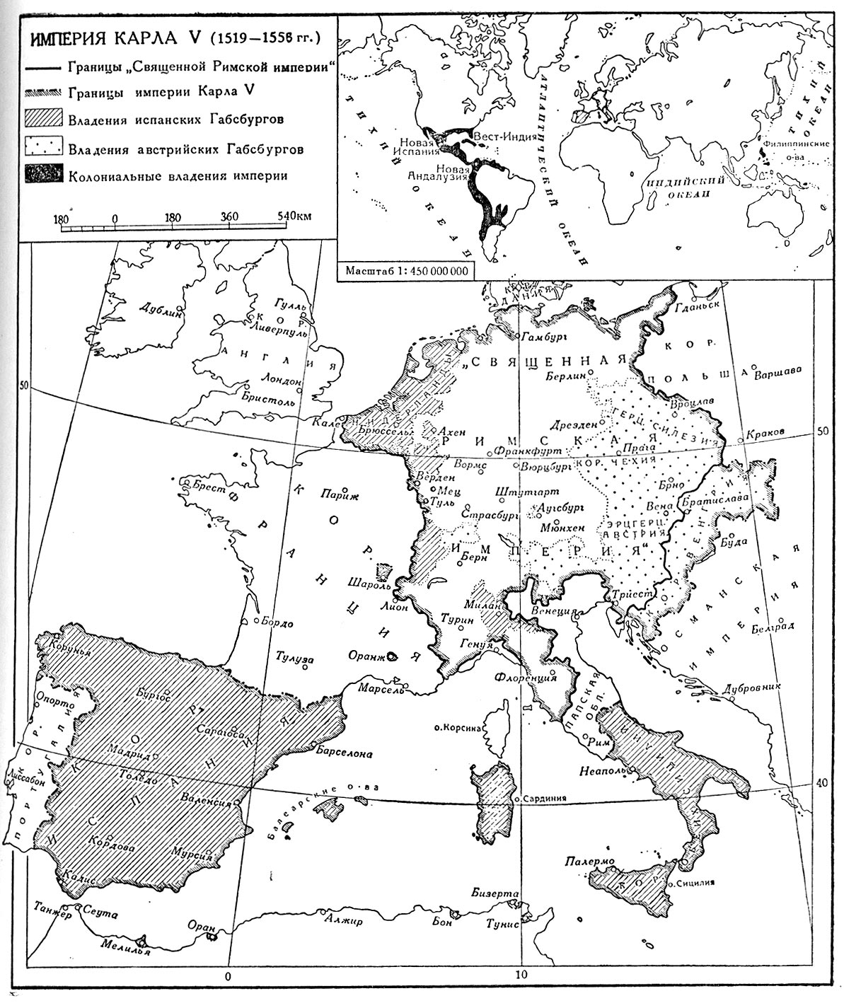 а) Империя Карла Пятого, помимо Священной Римской Империи Германской нации, в нее входили Испания и большая часть Италии, а также колонии испанцев в Новом Свете – Мексика, Перу и другие территории.