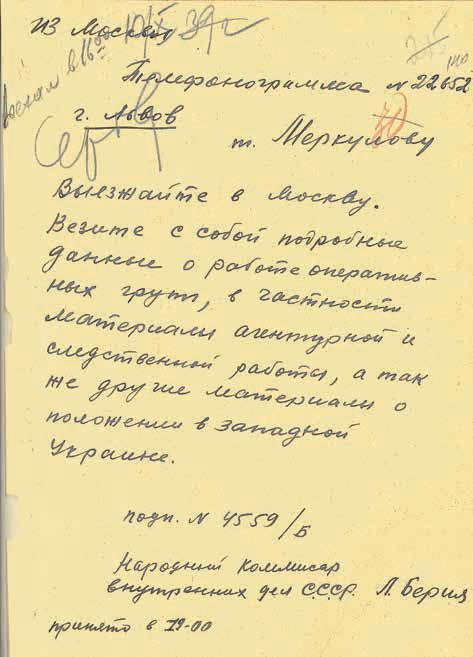 Телефонограмма Л.П. Берии В.Н. Меркулову о выезде в Москву.