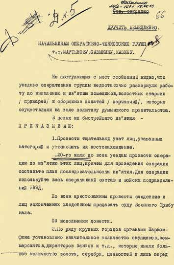 Приказ наркома внутренних дел УССР И.А. Серова об аресте помещиков и представителей бывшей румынской администрации и об изъятии ценностей. 18 июля 1940.