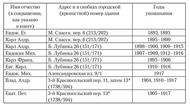 В книге «Вся Москва» есть и свой изъян. В ней публиковались те сведения, что подавались собственниками, и это могло расходиться с реальностью и подлинными паспортными данными. А могли попасть и устаревшие данные. Например, в адресной книге за 1894 год собственность на этот дом по-прежнему записана за Богдановой Васил. Макар. (Василисой Макаровной)[40]. Но уже на следующий год собственником значится впервые появившийся в адресной книге Флекенштейн Карл Александрович. И в том же 1895 году одновременно появляется и Карл Францевич Флекенштейн, но по другому адресу – Большая Лубянка, дом Московского домовладельческого товарищества.