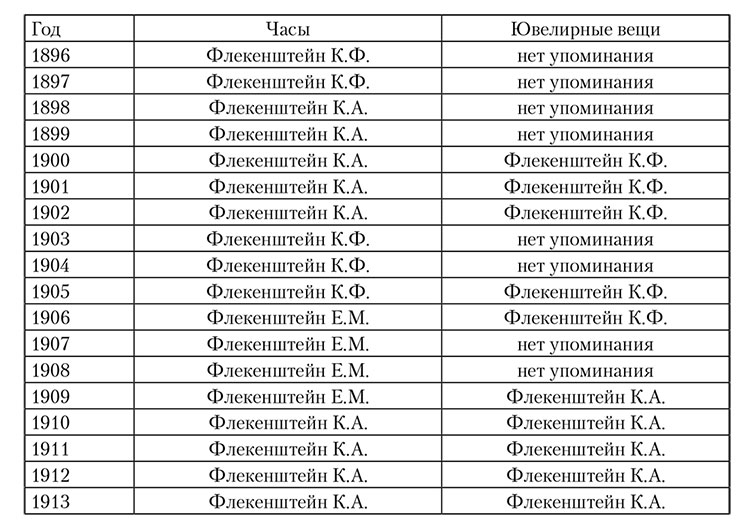 В адресной книге «Вся Москва» даны сведения раздельно по ювелирной торговле и часовому магазину. И указаны разные владельцы так, как будто магазинов было два. Хотя, помещение магазина было общим и довольно небольшим, но торговля часами и ювелирными изделиями внутри могла быть раздельной. Сведения для публикации в рубрике «Торгово-промышленные предприятия» в адресной книге «Вся Москва» Флекенштейн подавал каждый год, но есть пропуски в рубрике «ювелирные вещи». Возможно, в какие-то годы драгоценностями не торговали или не подавали сведений по ювелирной части. И вот какая в итоге картина: