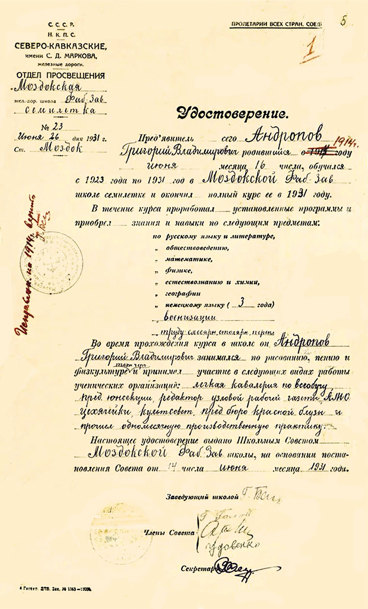 Как многие искренне считают, верить можно только документам, да и то, если есть уверенность, что они не поддельные. Вот один из самых ранних подлинных документов в личном деле: 26 июня 1931 года на имя Андропова Григория Владимировича (дата рождения указана 16 июня 1914 года) выдано удостоверение об окончании Моздокской фабрично-заводской школы-семилетки, в которой он обучался с 1923 по 14 июня 1931 года[150]. Вопрос, где Андропов учился до поступления в семилетку и где получил начальное образование, остается до сих пор открытым.