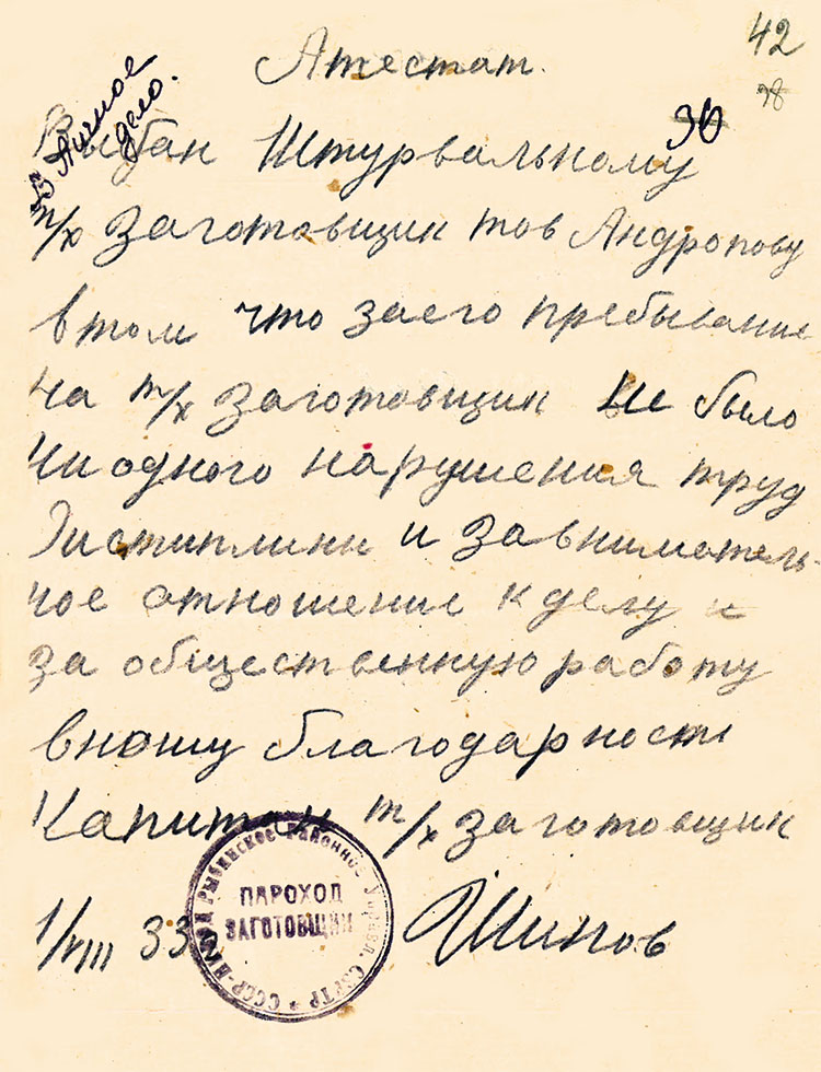 Навигацию следующего, 1933, года Андропов начал с 29 апреля в должности штурвального буксира «Заготовщик», с 1 августа был переведен штурвальным на буксир «Яков Свердлов»[163]. Капитан «Заготовщика» выдал Андропову аттестат, где отметил отсутствие нарушений трудовой дисциплины и вынес благодарность «за внимательное отношение к делу и за общественную работу»[164].
