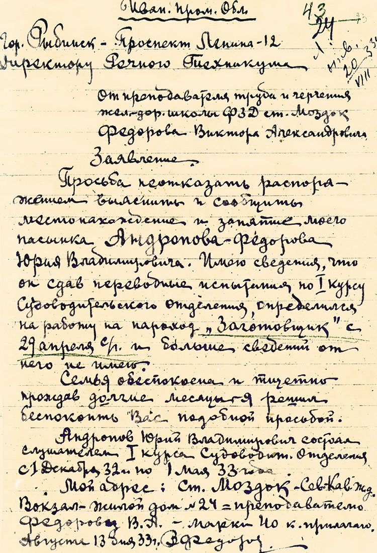 Письмо отчима Андропова В.А. Федорова директору речного техникума