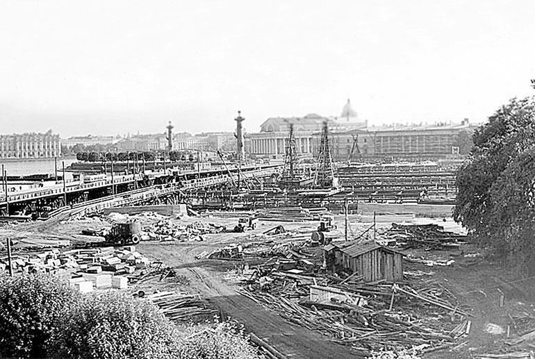 Строящийся мост Строителей (Биржевой). Фото 1958 года