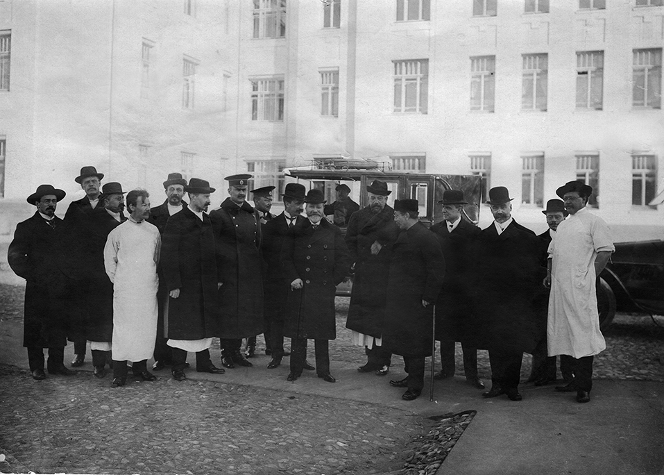 Открытие Солдатенковской больницы 23 декабря 1910 г. На фото стоят слева направо:2-й А. Е. Соловьев, 3-й И. И. Мнацаканов, 6-й М. П. Киреев, 7-й В. Ф. Джунковский, 8-й А. А. Адрианов, 9-й А. Л. Кноп, 10-й Ф. С. Рахманов, 11-й Ф. А. Гетье, 12-й Н. И. Гучков, 14-й И. И. Барышников, 16-й В. Н. Розанов. На улице в тот день было около 4 градусов тепла
