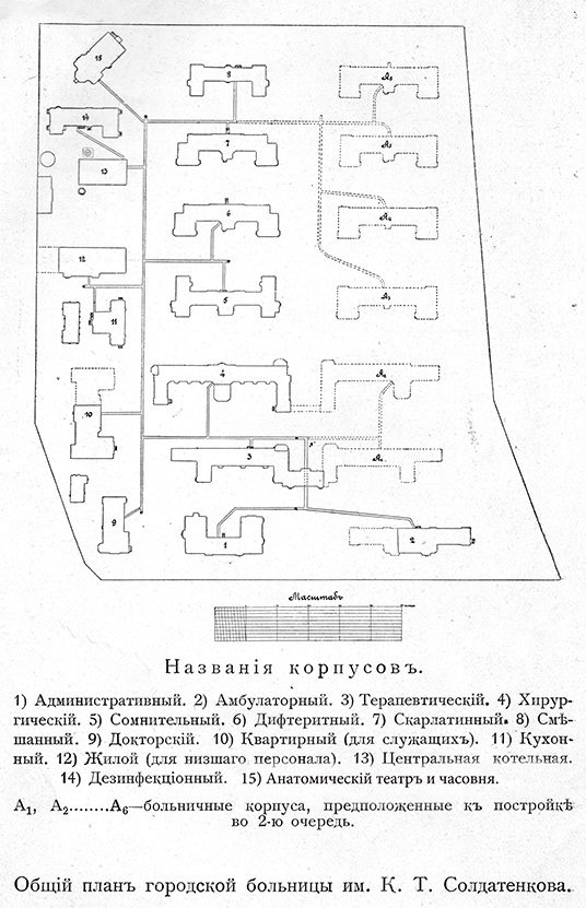 В настоящее время открыта больница имени К. Т. Солдатенкова, и заразные ее отделения первой очереди работают полным ходом, в ближайшее время будут открыты последовательно терапевтический и хирургический корпуса, и можно надеяться, что в марте сего года населению будут предоставлены все 245 кроватей этой больницы. <…> Можно с уверенностью сказать, что и с открытием всех кроватей первой очереди Солдатенковской больницы недостаток в больничных кроватях будет таким же, каким был и до текущего года…». В итоге для ускорения строительства второй очереди больницы Городская Управа организовала Комиссию под председательством члена Управы IX Отделения В. Ф. Малинина в составе некоторых членов Врачебного Совета, при участии главного доктора больницы имени К. Т. Солдатенкова Ф.А. Гетье, члена Технического Совета архитектора И. А. Иванова-Шица. К 30 октября 1910 года комиссия представила эскизные проекты предполагаемых к постройке корпусов. В результате к осени 1913 года на территории больницы появились и открылись следующие новые больничные корпуса: а) для острозаразных больных на 72 кровати (в настоящее время №9), б) для рожных больных на 68 кроватей (в настоящее время корпус №8), в) для заразных больных на 62 кровати (в настоящее время корпус №7). Кроме этого к августу 1914 года к терапевтическому корпусу №1 пристроен корпус №11 (в настоящее время – корпус №11), а ко второму хирургическому корпусу пристроен корпус №10 (в настоящее время – №10). Здания были поставлены под крышу, но внутренняя отделка не была завершена. В итоге общее число кроватей в больнице к августу 1914 года возросло до 545 (См.: МФ. 50 лет сов. Власти / Отчет. Л.6).