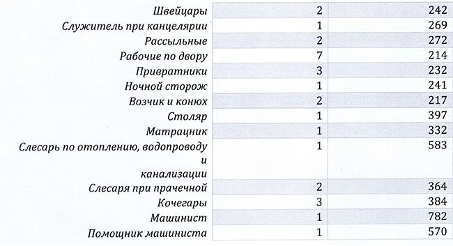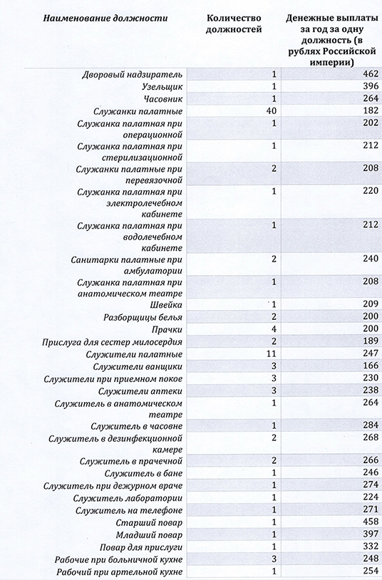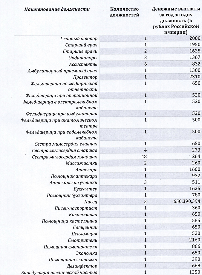 Данное штатное расписание не является только списком должностей, который мы приводим полностью (за исключением сверхштатных служащих и прислуги), но и погружает нас в атмосферу столетней давности. Благодаря данным перечня мы можем обозревать широту выполняемых работ в больнице и имеем возможность сделать разного рода количественные и финансовые подсчеты. Здесь все говорит само за себя. По данным штатного расписания мы понимаем, что штат больницы, рассчитанной на 340 кроватей, составлял 223 человека, из них врачей, включая главного доктора – всего 15. Кроме того, приглашались специалисты со стороны, которые числились за штатом, и работали в основном, замещая сотрудников больницы, ушедших в отпуск.