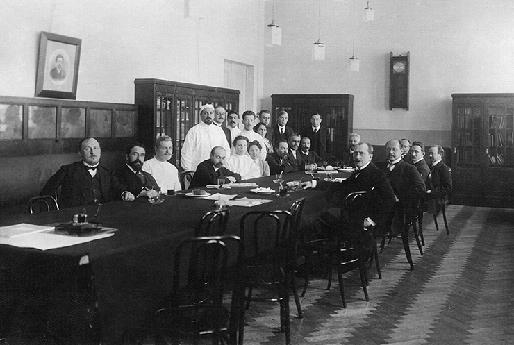 1913 год. На конференции врачей.Слева направо стоят: Б. Н. Виноградов (1-й), Б. И. Нейман(3-й) А. Д. Очкин (7-й), А. И. Абрикосов(8-й); сидят: В. М. Васильев (2-й), А. Е. Соловьев (3-й), Р. И. Хаймович (4-й), С. Г. Белецкая(6-я), Г. К. Хрущев (7-й), М. П. Киреев (9-й), Ф. А. Гетье (10-й), В. Н. Розанов (14-й), В. И. Соколов (15-й)