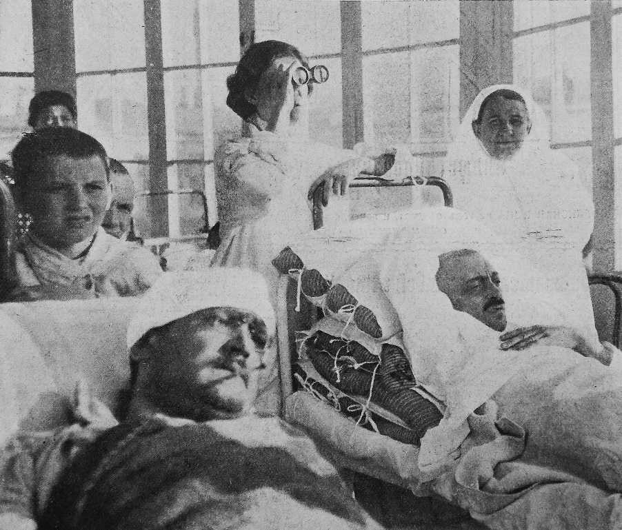 Каждый день пребывания в Москве императора и его семьи был расписан заранее. Но одно событие не входило в планы великодержавной четы. Вспомним, что на Восточном фронте война началась с Восточно-Прусской операции. 4 августа русская армия перешла границу, начав наступление на восточную Пруссию. 1-я армия двигалась на Кенигсберг с востока, 2-я армия – с запада от Мазурских озер. Первую неделю действия русских армий были успешными. 7-го августа Гумбинен-Гольдапское сражение закончилось в пользу русской армии. Но эти успехи были временными. После разгрома 2-й армии генерала Самсонова немцами, 3 сентября 1-я армия отошла на прежние рубежи (См.: ВБ. Миронов. Первая Мировая война. М., 2014. С. 119). В кровопролитных сражениях первых дней войны русские войска несли тяжелые потери. Раненых размещали в полевых лазаретах, а некоторых для лечения направляли в Петроград, а также в Москву, куда уже 6 августа первые раненые прибыли на Александровский(Белорусский) вокзал. Встречу прибывающих раненых в подробностях описал корреспондент журнала «Заря»: «Каждый вечер громадные толпы собираются у вокзалов тех дорог, по которым привозят в Москву с театра войны раненых. Тихо подходит к платформе длинный поезд. Во многих вагонах окна занавешены. Здесь лежат тяжелораненые, которых избегают волновать и тревожить. В другие окна выглядывают осунувшиеся, но бодрые, почти веселые лица легкораненых. К вагонам бегут врачи, санитары, сестры милосердия, сотрудники «Красного креста» и других учреждений, заботящихся о жертвах войны.
