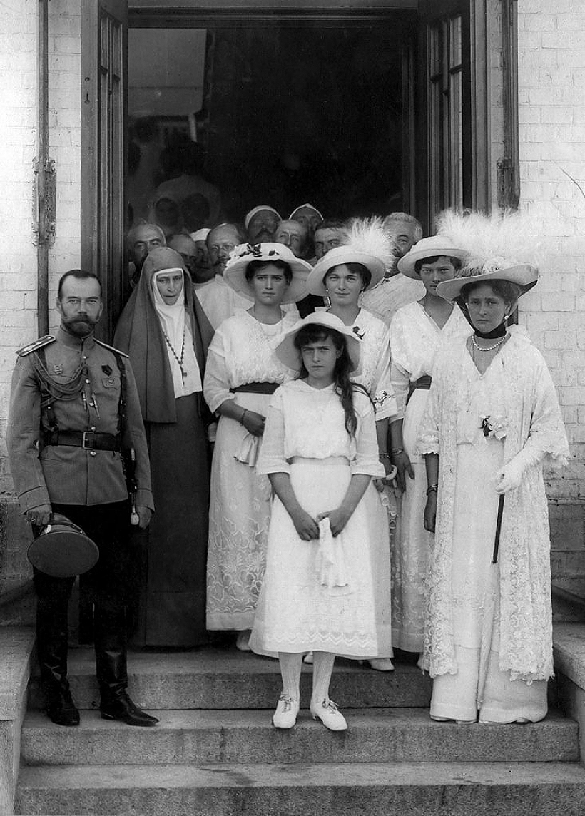 Император Николай II, императрица Александра Федоровна, великие княжны Ольга, Татьяна, Мария, Анастасия, и великая княгиня Елизавета Федоровна сфотографировались вместе с врачами, встречавшими и сопровождавшими их на ступенях 10 хирургического корпуса. (ГАРФ. Ф.826. Д. 937)