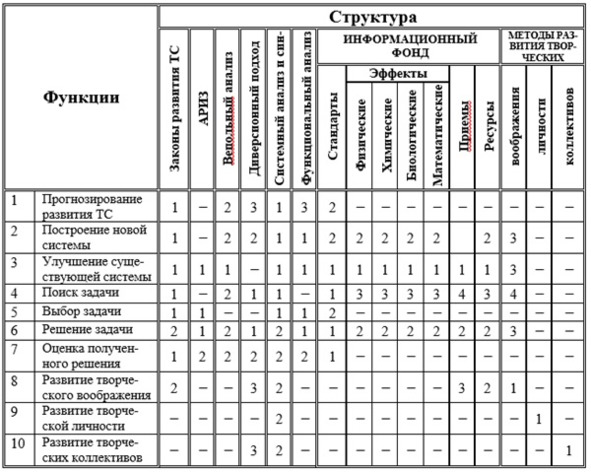 Использование различных элементов ТРИЗ для конкретных функций показано в таблице 2.1: «Функции и структура ТРИЗ».