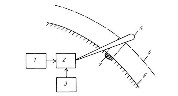 1 – генератор; 2 – излучатель; 3 – механизм поворота излучателя; 4 – луч; 5 – поверхность Земли; 6 – слой ионосферы; 7 – заданный район.