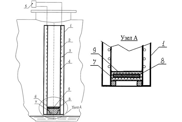 1 – корпус; 2 – полый стержень; 3 – герметичная полость; 4 – токопроводящая обмотка; 5 – приемник сигнала; 6 – поплавок; 7 – носитель; 8 – полость; 9 – магнитная жидкость.