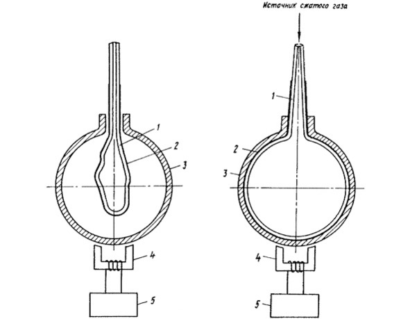 Оболочку раздувают сжатым газом, пока она плотно не прижмется к внутренней поверхности изделия. На наружной поверхности изделия установлен индуктивный преобразователь с незамкнутой цепью.