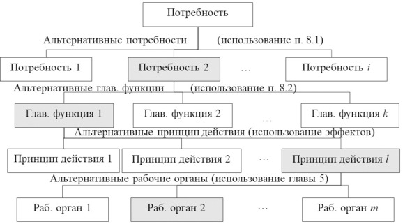 Представим описанную последовательность проведения углубленного прогноза в виде графа (рис. 7.5). Показан граф только для выбранных потребности, главной функции, принципа действия, основных функций и основных элементов.
