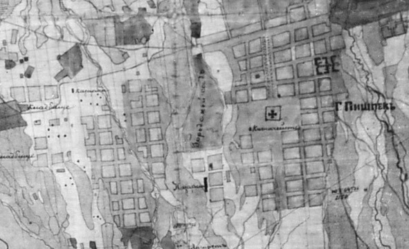 Разбивка городских усадеб осуществлялась по плану, и особое место уделялось базарной, церковной и парадной площадям, территории для тюрьмы, казарм, лазарета и кладбищам. Казенные земли отводились на почтовый тракт и древонасаждения – городские сады и будущую Карагачевую рощу. С запада город ограничивался старым руслом реки Ала-Арча – каменистой поверхностью и оврагами, где началась разбивка казенного сада, строительство военных казарм и лазарета.