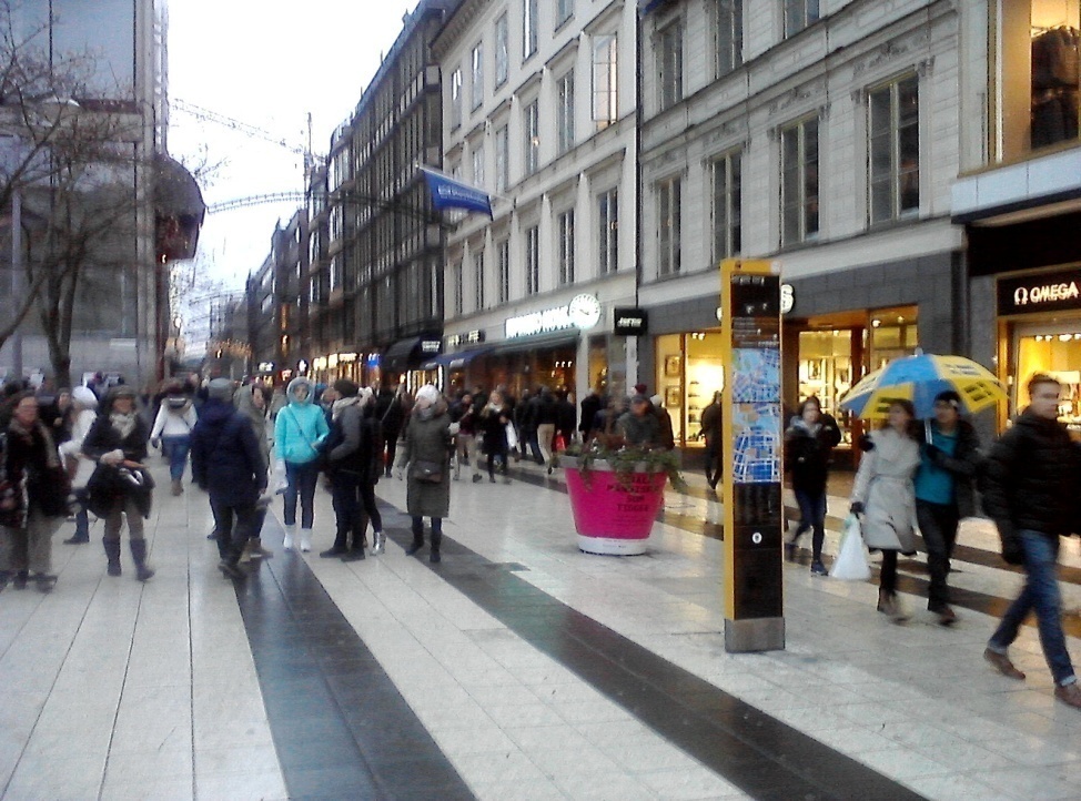 Несмотря на дождь в центре людей много. В основном молодежь, а так же люди среднего возраста и достатка (старики, по всей видимости, сидят в пансионатах, такие традиции – им не позавидуешь). Много пар. Встречаются типично шведские блондинки с типично черными парнями. Толерантность. Чувствуется жизнь сытая и спокойная. 200 лет без войны. Спасибо Петру 1 и его победе под Полтавой – отбил у шведов охоту воевать. Героическая была нация, но стала паническая. Всюду мерещатся русские шпионы (автор убедился сам). Всего боятся и стремятся в НАТО. Не живется им спокойно.