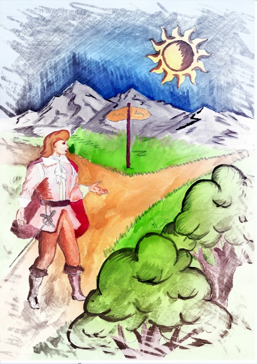 – Правая дорога, ведёт в соседнее царство. Пойду туда – проживу век с нелюбимой, но помогу и отцу, и всем подданным. От разрухи и голода избавиться. Вот так я и стою, не знаю куда идти и что мне выбрать.
