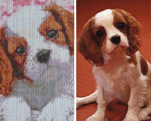 Мы не знаем, что испытывают собаки, когда после нескольких месяцев в питомнике их разлучают с их биологическими родителями и отдают человеку. Кто-то говорит, у них нет понимания, что их разлучили с мамой, другие уверены, что собаки воспринимают питомник как свою семью с собратьями и переезд в новый дом для них стресс. Но в любом случае, когда мы тронулись и машина поехала, моя девочка не проявляла никаких признаков беспокойства, скорее с удивлением и любопытством разглядывала меня, как бы спрашивая: «Ну и кто ты такая? Куда меня везешь?» Кстати, с именем я определилась, даже еще когда она не родилась. И не только с именем, но и с ее образом. Вот почему я четко знала, что она – моя. Я выложила картинную мозаику за несколько месяцев до ее появления. Оригинал оказался точной копией картинки. Вот что бывает, когда четко знаешь, чего хочешь.