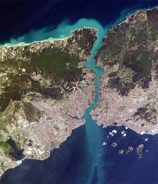 Илл. 1. Снимок с МКС 2004 года (Википедия). Снизу Мраморное море, сверху Чёрное море. Их соединяет 30-километровый пролив Босфор