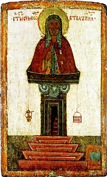 Илл. 16. Симеон Столпник. к. XV в. Новгородский государственный объединенный музей-заповедник. Предмет внизу справа – колодец