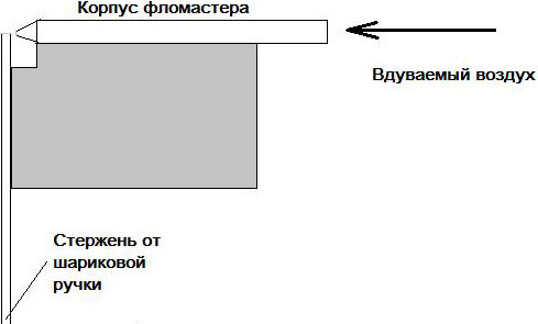 Знайте – чем тоньше игла, тем тоньше распыл. Только я не советую брать слишком тонкую иглу, с ней тоже морока – она часто забивается. Иглу и корпус шариковой ручки или фломастера надо установить на брусочек так, как показано на рисунке. Закрепить их можно клеем, скотчем или изолентой.