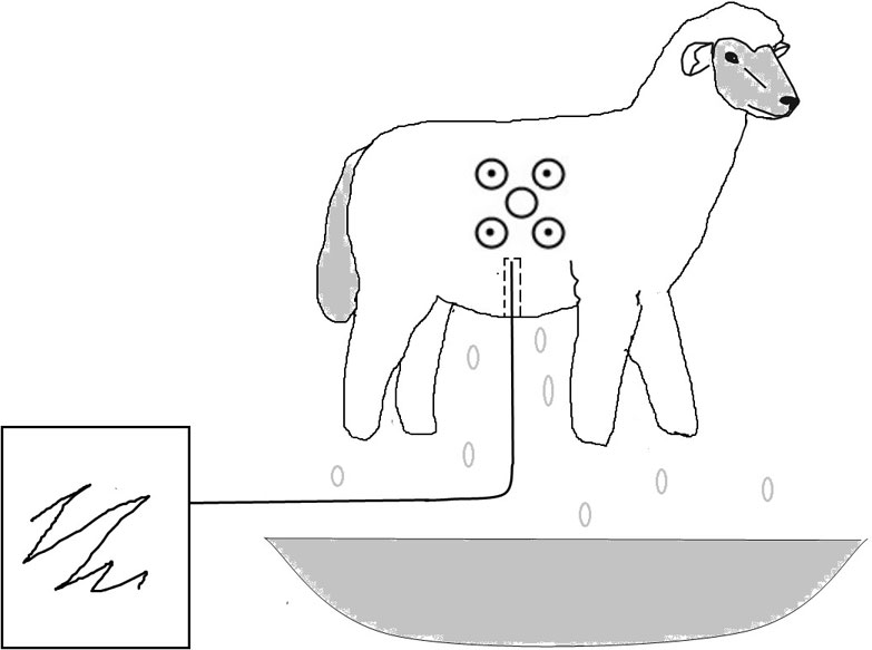 Из рисунка понятно, что овечка, которую окунули в лак, подвешена на стальной спице. Для этого в животе овечки при лепке, или в ноге, протыкается технологическое отверстие, и овечка насаживается им на спицу. Второй конец спицы закрепляется на полене. После окунания надо следить, чтобы не было скапливания лака в неровностях.