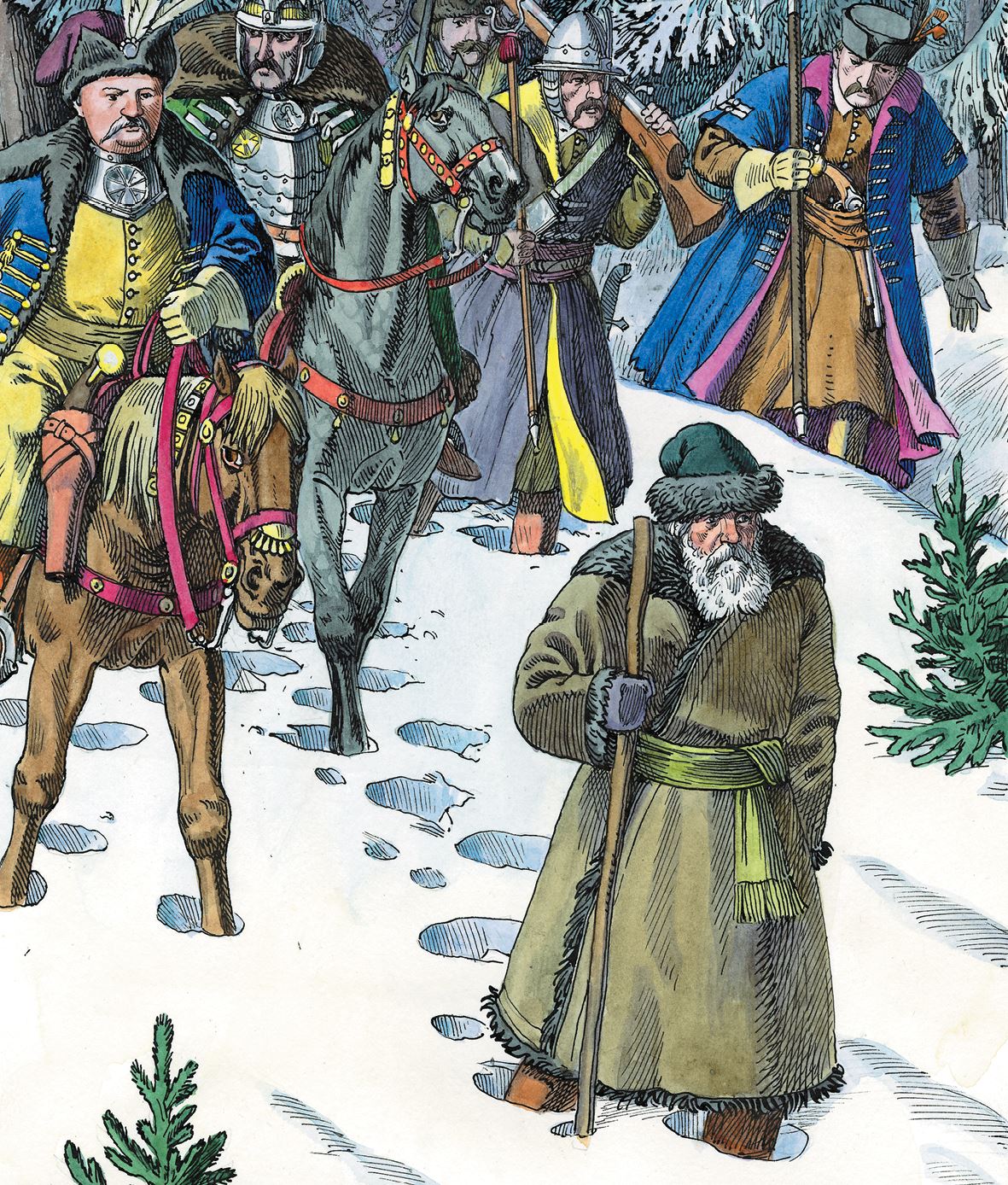 Ведёт их Сусанин. Палка в руках дубовая. Свернёт Сусанин правее, свернёт чуть левее. Прямо пройдёт. Снова правее. Снова левее. Послушно следом идут поляки.