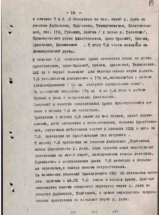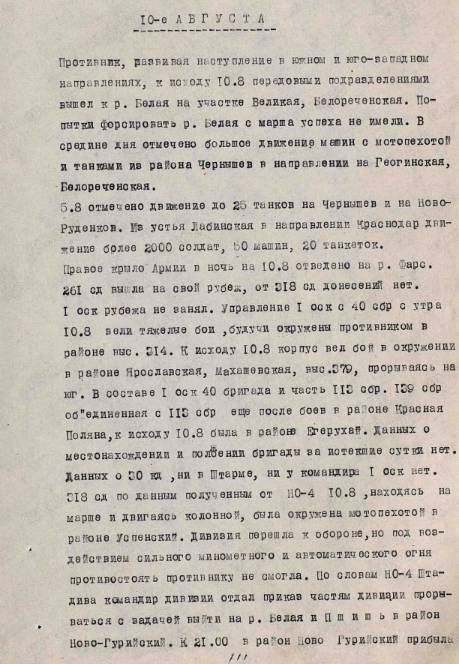 «Усть-Лабинск оставлена нашими частями 8 августа вечером., а 9 августа без боя занята противником. Основная масса ценностей вывезена, роздана или уничтожена».