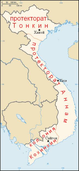 Страна искусственно разделяется на три части – колонию Кохинхина (Южный Вьетнам), протектораты Аннам (Центральный Вьетнам) и Тонкин (Северный Вьетнам). Вместе с Лаосом и Камбоджей Вьетнам вошёл в состав Французского Индокитая.