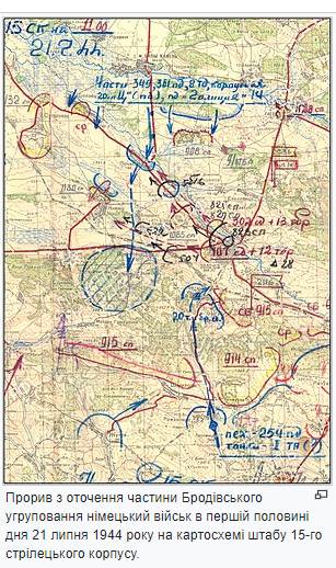 «У ході наступальної операції військ Першого Українського фронту в лісах, що південно-західніше від Броди, було оточене угрупування противника в складі п’яти дивізій, корпусної групи і частин посилення (361, 349, 340 пд, 454 охоронна дивізія, 14 пд «СС» «Галичина», корпусна група «С», 300 загін штурмових гармат, 505, 507 окремі танкові батальйони, 508 будівельний батальйон, 70 саперний батальйон).