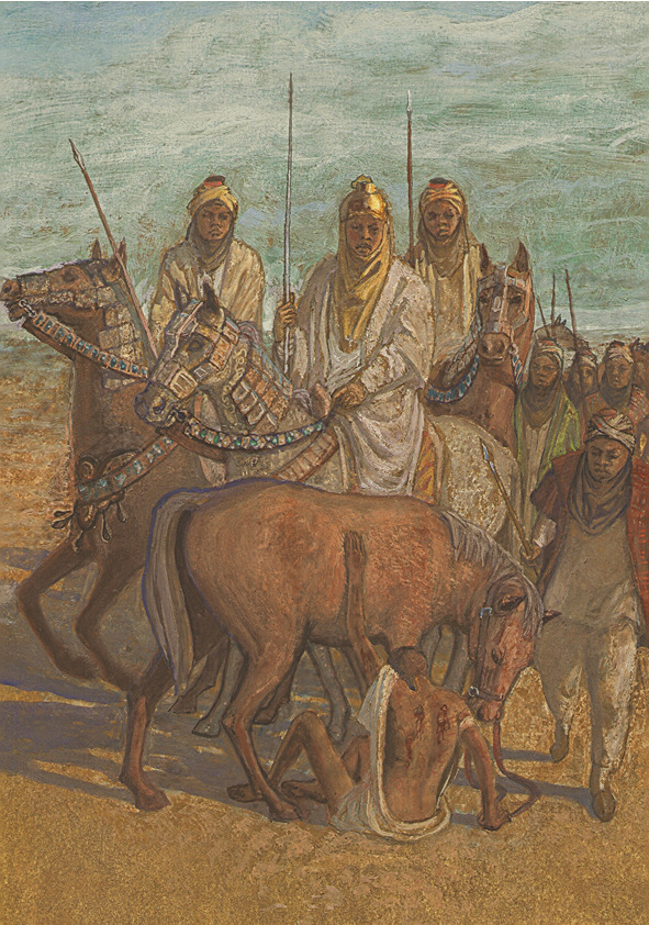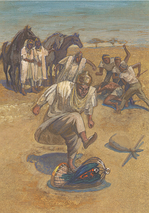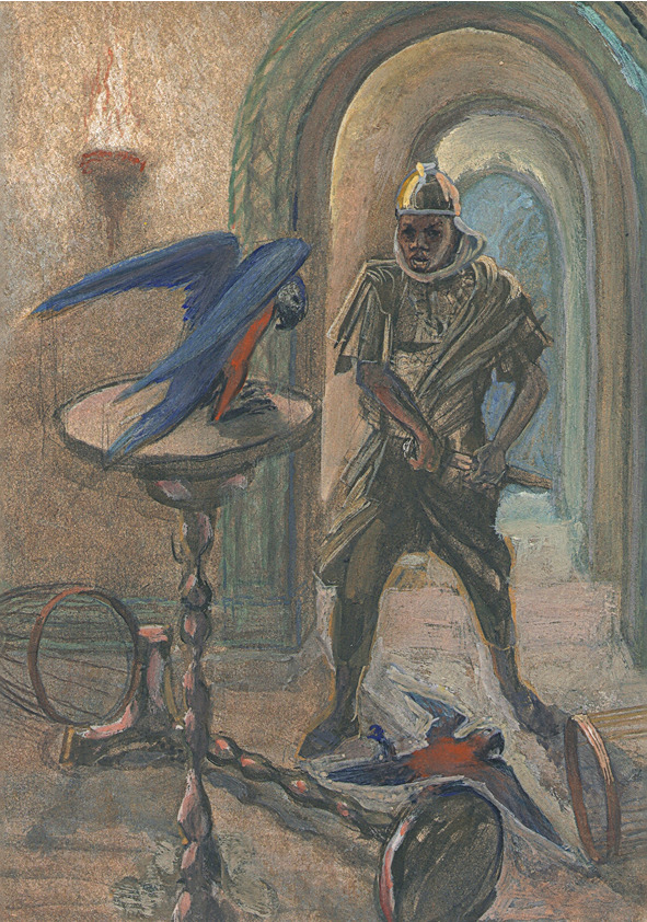 Не столь её слова, как громкий крик, который мог разбудить стражу, помутили рассудок Мусы. Яростно сверкнув очами, он выхватил из клетки птицу, и, сжав от злости, прошипел: «Ты? Собственность моя? „Дочь паники и порожденье крика“, мне хочешь помешать идти за братом? Ну, врешь! Не выйдет!» С этими словами он свернул бедняге шею, да так грохнул об пол, что проснулся Аку.