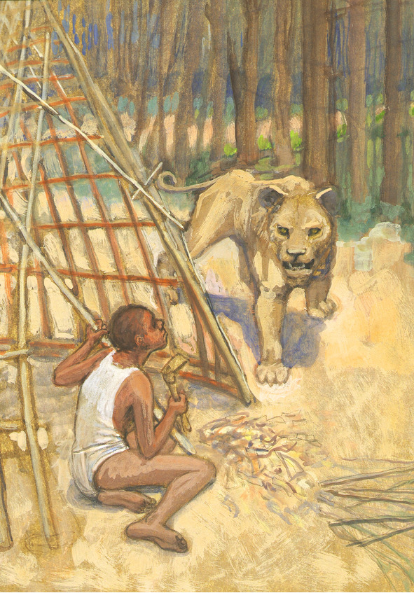 Трепеща от неожиданного рыка, незнакомец выронил свои вещи, и рухнул перед львенком на колени. Голос его дрожал, когда в ответ он стал произносить: «Я, это… Я – „Строитель“. А в том, что ты меня не видел, нет моей вины! Меня все знают: четвероногие и двуногие, крылатые и хвостатые. Те, у кого есть шерсть, и те, у кого ее нет, как у меня!»