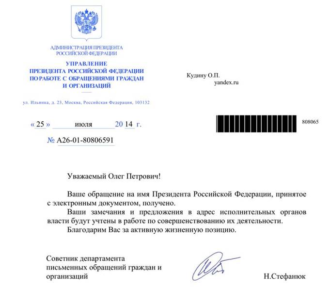 Администрация Президента России является связующим звеном между мною, как гражданином страны и Президентом России, поэтому я прошу Вас не направлять мое обращение на рассмотрение в другие госструктуры, а принять решение на своем уровне.
