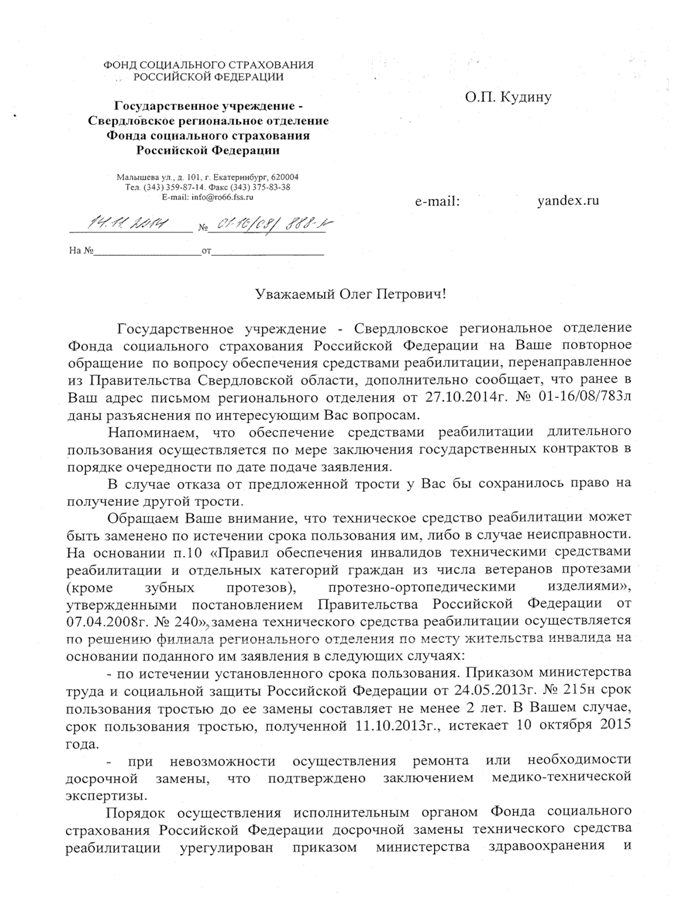 Данное обращение написано с целью урегулирования моих вопросов в досудебном порядке, Правительство России, которое приняло Постановление регулирующее данную сферу, в порядке исключения может принять решение о внесении изменений в бессрочную ИПР в части ТСР, без переосвидетельствования в связи с грубейшим нарушением требований Федеральных нормативных актов и по крайней мере гарантировать мне человеческое отношение со стороны работников МСЭК. 20 октября 2014 г. Кудин О.П.