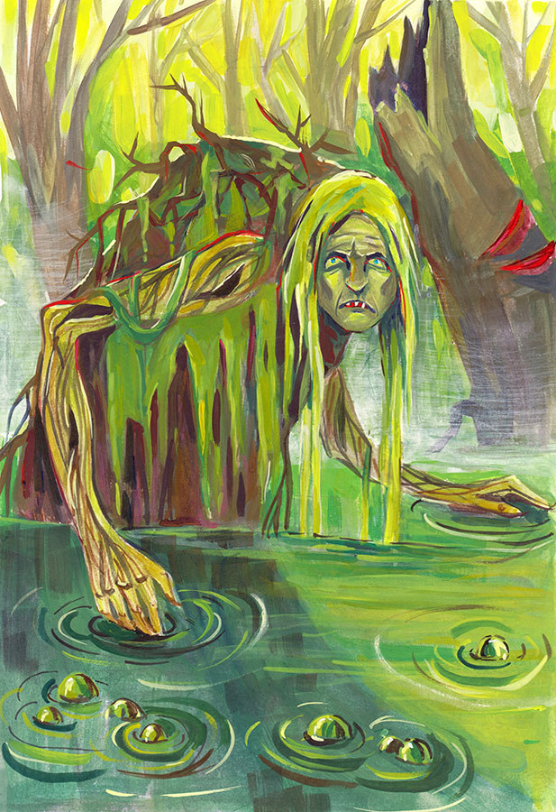 Из болота медленно поднималось чудище, всё покрытое илом, болотной травой и свисающим серым мхом. Из-за зелёных длинных волос, его глаза смотрели холодным белым светом. По своему виду он напоминал очень крупного мужика. Хотя даже издалека и в темноте, любой бы догадался, что это страшилище вовсе не человек. Чудовищем был Багник, злой дух, живущий на болотах, и теперь поселившийся в этих местах.