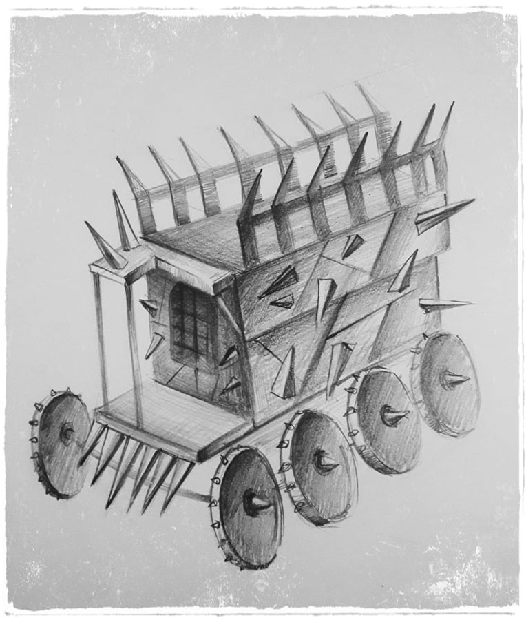 Рядом стояла то ли тележка, то ли гора металла на колёсах, то ли огромный бронированный ёж. Во все стороны здоровенной железной повозки торчали острые пики металлических стержней, напоминающих кривые сосульки. Четыре колеса стояли с каждой стороны, по кругу их украшали колючие зубцы, прокалывающие твёрдую дорогу. Вход вовнутрь стального зверя закрывала железная решётка. Коней, конечно же, никаких не было.