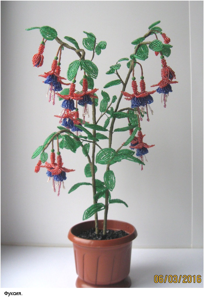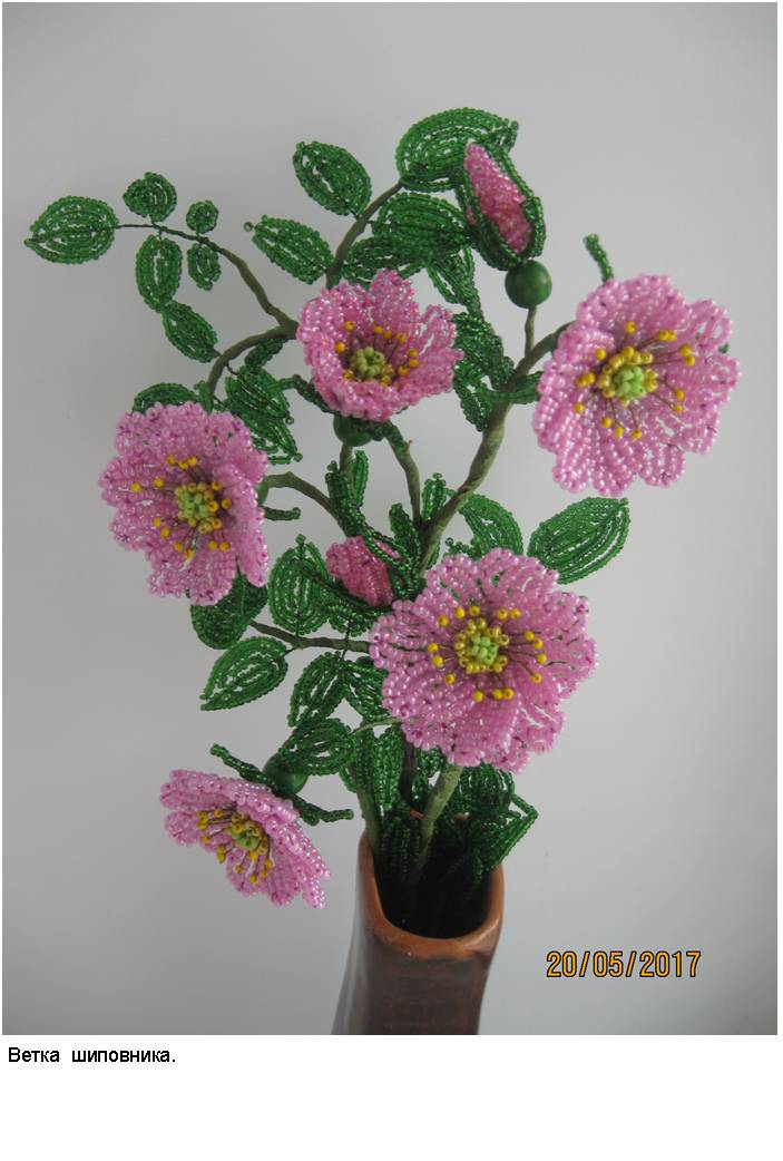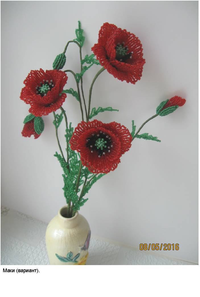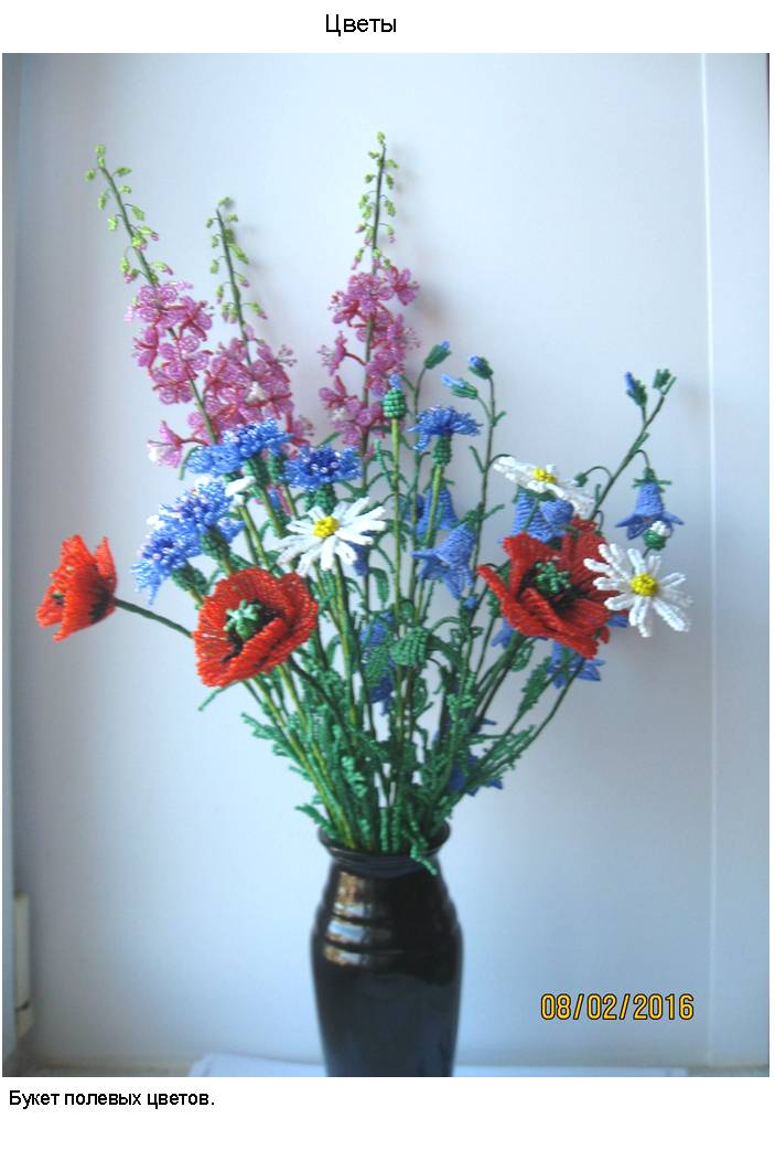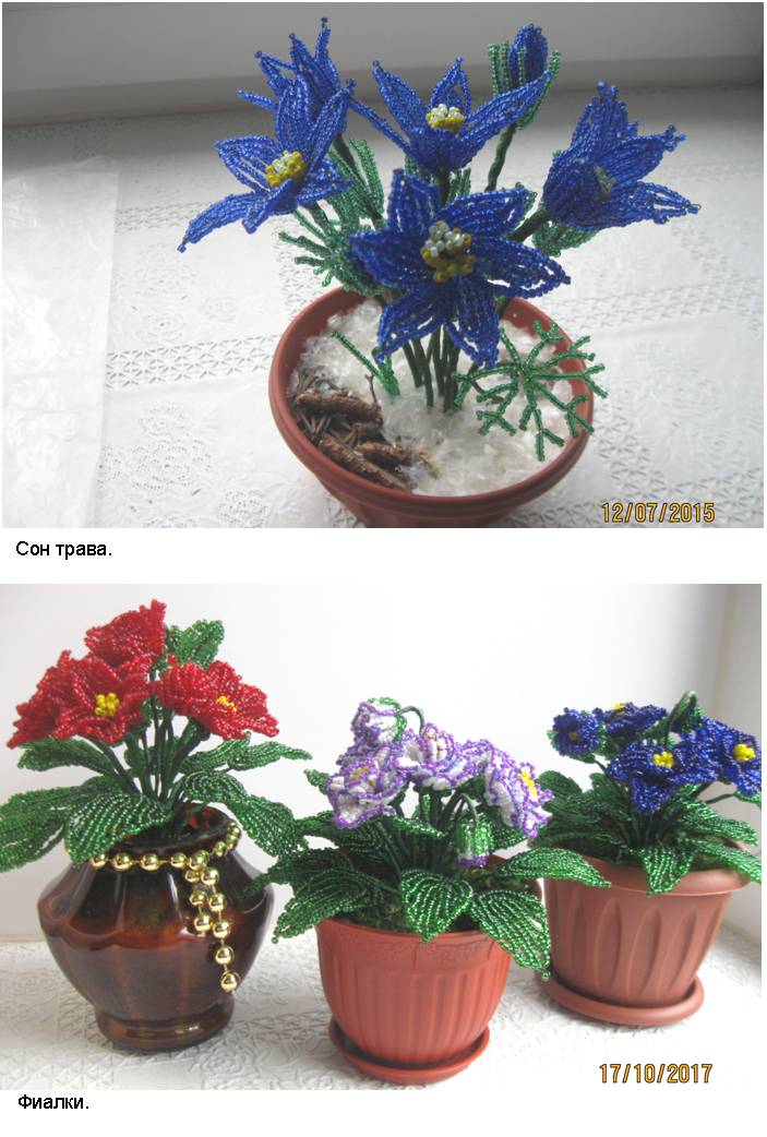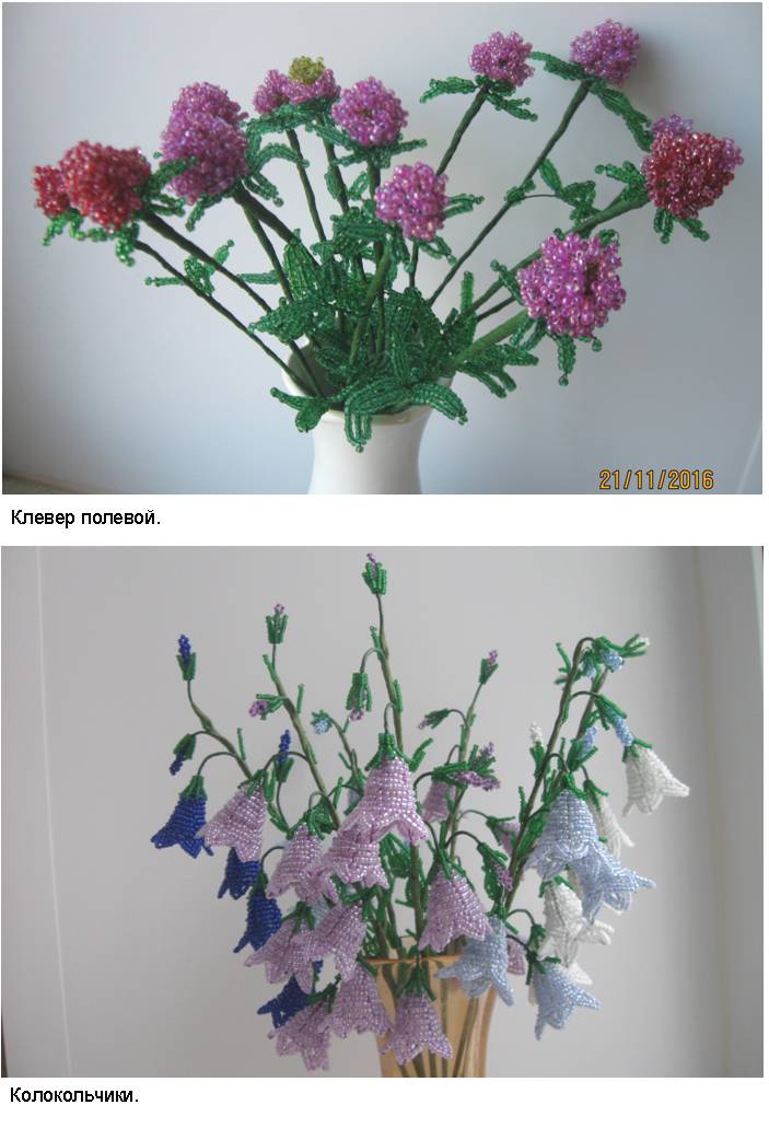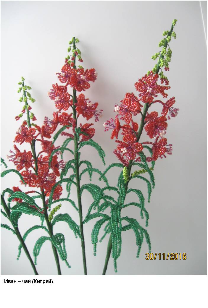 Технология (способ изготовления заготовок, сборка изделий и применяемые материалы) и подробные (пошаговые) изображения приведены в моей электронной книге «Деревья и полевые цветы из бисера», опубликованной в компании Лит Рес.
