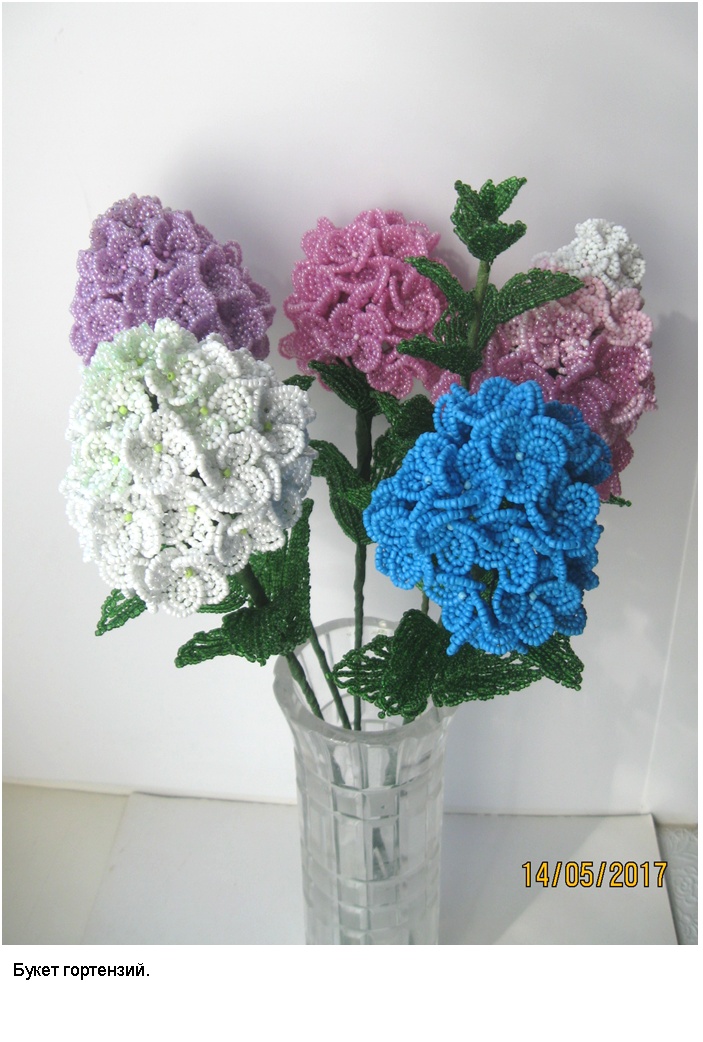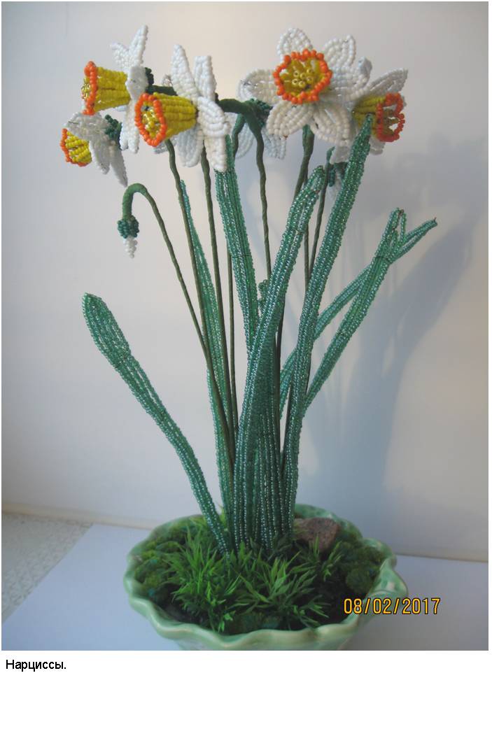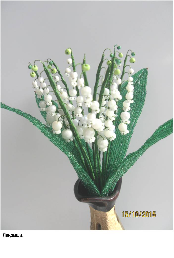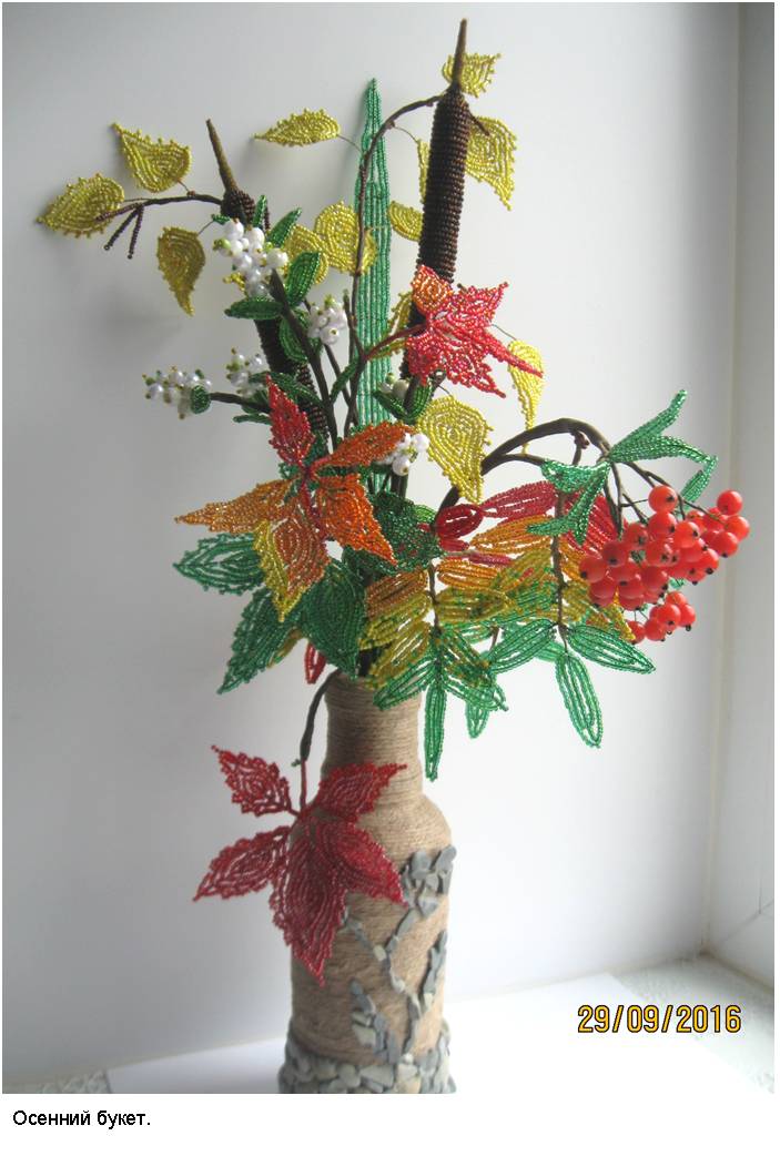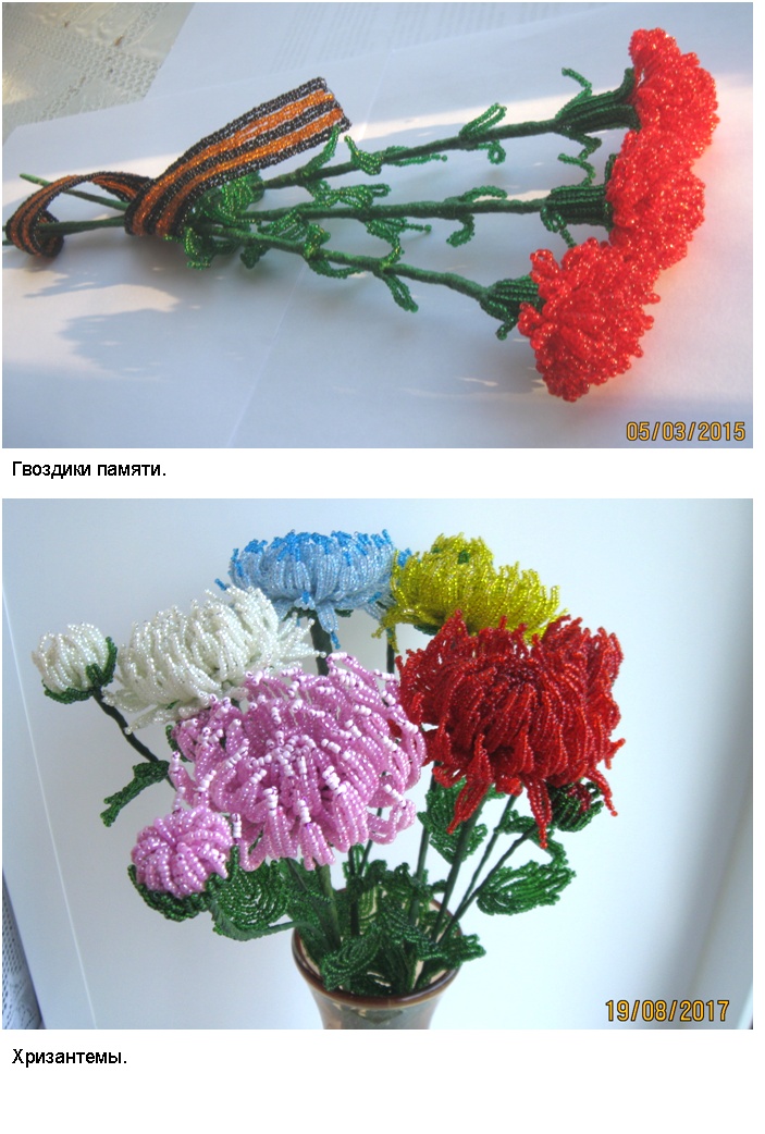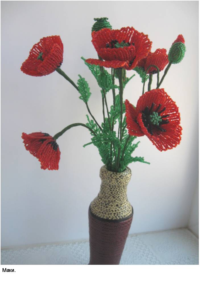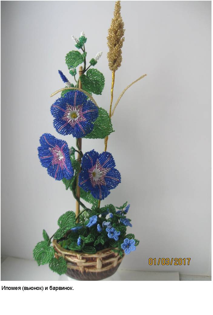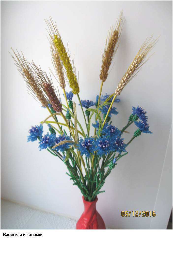 Технология (способ изготовления заготовок, сборка изделий и применяемые материалы) и подробные (пошаговые) изображения приведены в моей электронной книге «Деревья и полевые цветы из бисера», опубликованной в компании Лит Рес.