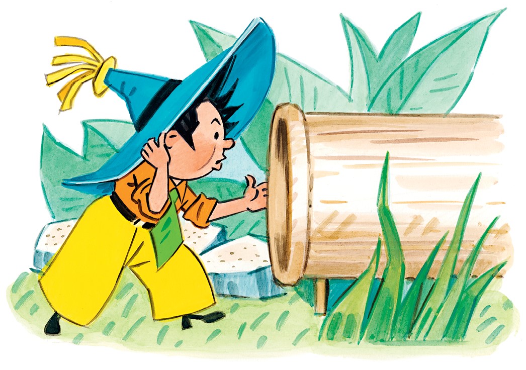 Он нашёл подходящий лопух, оторвал лист и обернулся им, как большим полотенцем. В руку взял травинку – отгонять комаров и решил подкрасться поближе к лужайке, где на праздник собрались малыши и малышки.