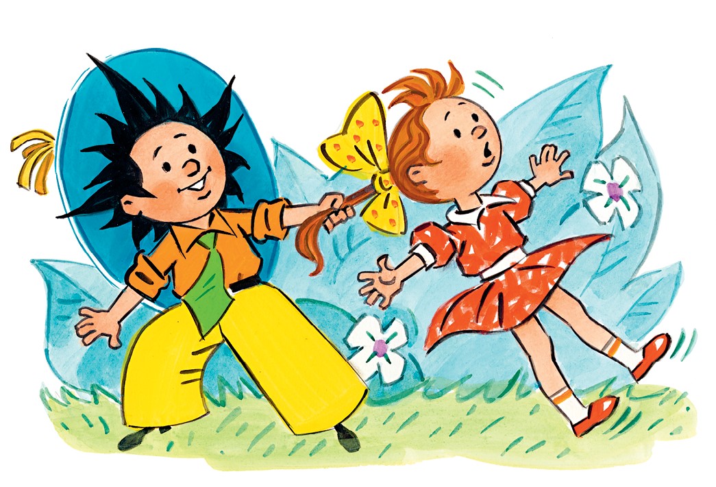 Но вместо знакомства Незнайка коварно дёрнул её за косу. Малышка бросилась бежать и закричала: