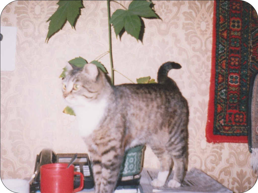 Кеша уверенно бегал, прыгал, скакал по всей мебели и квартире. Он стремительно рос и развивался. Его окрас стал чётким вроде тигриного, как у рыжих котов, только из серо-синих, черных полос и белых участков. Летом часть чёрных полос выгорала на солнце и приобретала карий пигмент, а кончики некоторых волос местами придавали шерсти почти рыжий пигмент поверх основного окраса. На груди у Кеши, как и у Шурика, был беленький галстук, но он больше был похож на треугольник белой рубашки, видневшейся из-под серого пиджака. На двух передних и задней левой лапках были надеты аккуратненькие белые тапочки, а на задней правой лапке – белый сапожок. Лапка с сапожком, как в шутку говорила мама, чуть-чуть не получилась. Хвостик у Кеши был пропорционально телу немного короче, чем у других кошек, что добавляло ему изящества. Теперь мы уже не боялись за Кешу с Шуриком, когда они оставались дома хозяйничать.