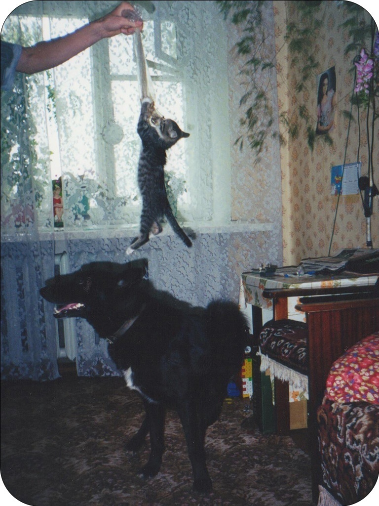 В первую Кешину осень, в связи с началом учебного года, поездки брата на рыбалку стали заметно реже. Как сейчас помню первое возвращение брата с рыбалки после небольшого перерыва! Рыбы он поймал совсем немного, так как съездил буквально на пару часов после школы. Но как его встретил Кеша! Женя ещё не успел достать из кармана пакет, как Кеша уже висел на пакете, вцепившись когтями и зубами! Можно было подумать, что брат достал из кармана пакет вместе с Кешей! Кешка так яро вцепился в пакет, что как бы высоко брат не поднимал пакет – Кеша не отцеплялся! Мы вместе долго бегали с пакетом по дому, веселясь над Кешиной радостью. Шурик разделял наше веселье, бегая вместе с нами. Мама сбегала за фотоаппаратом и запечатлела этот яркий момент.