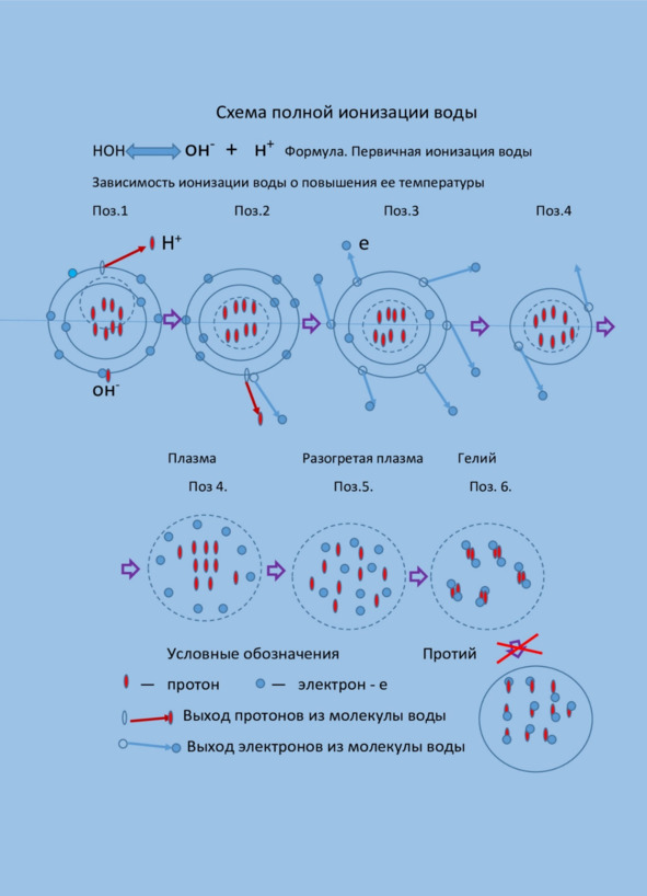 Поз.1. Вода распадается на положительный ион водорода Н+ (протон) и отрицательно заряженный ион ОН – . Дальнейшая ионизация воды изображена на позиции 2. Нагрев заставляет выделиться из иона ОН – , протон и электрон. На этом этапе, сохраняется в целости атом кислорода. Дальнейший нагрев заставит атом потерять электроны внешнего уровня, Поз.3. а затем и остальные Поз.4, Поз.5.