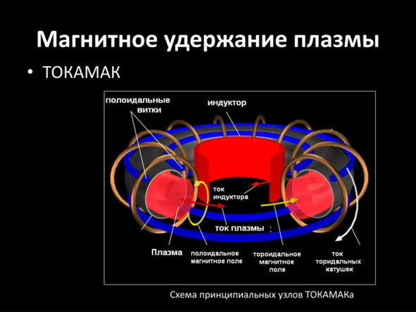 Была взорвана термоядерная бомба, основанная не на делении ядра, а на термоядерном синтезе. Взрыв Т/Я бомбы дал уверенность, что такой синтез можно создать на Земле. Так родился Токамак, в котором было решено произвести синтез частиц, при соединении которых выделяется много, очень много энергии. Это была и есть конечная цель создания термоядерной установки, которая должна обеспечить человечество неограниченной и безопасной энергией. На основании научных данных, изобретена, спроектирована и собрана установка под названием ТОКАМАК.