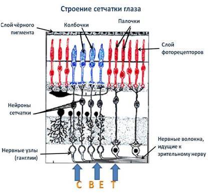 Обычно в сетчатке различают десять слоев, причем светочувствительные клетки находятся в самом внутреннем ее слое. Более того, палочки и колбочки ориентированы к свету своими внутренними сегментами, не содержащими зрительного пигмента, а поглощение света, приводящее к возникновению нервных импульсов, начинается в наружных сегментах рецепторов.