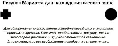 В месте вхождения зрительного нерва в глазное яблоко нет ни палочек, ни колбочек. Изображения предметов, возникающие на этом участке, не воспринимаются нами. Поэтому этот участок получил название слепое пятно. Слепое пятно легко обнаружить, закрыв левый глаз и смотря правым на крестик (см. рисунок Мариотта для обнаружения слепого пятна). Если глаз приближать к рисунку, то на некотором расстоянии кружок становится невидимым. Это значит, что его изображение попало на слепое пятно.
