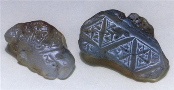 Среди этих кусков кварцита явными артефактами являются, по крайней мере, два. Один из фрагментов содержит 4 символа, заключённые в треугольники (они попарно и последовательно связаны между собой внутренним смыслом), второй меньше размером и пострадал больше – риски треугольников и внутренних изображений прочитываются частично. Полупрозрачные обломки сероватого или желтовато-зелёного цвета (зависит от освещения) несут на себе следы термического воздействия (взрыва? извержения?) – во всяком случае, присутствует впечатление скоротечного процесса (желтовато-бурый цвет в некоторых углах, оплавленные кромки). Дополнительную окатку камни явно получили либо на дне древнего моря, либо во время катаклизмов ледникового периода. Оттенок камней открывает путь к возможному объяснению, почему в сохранившемся предании бытует версия, будто "скрижаль" учителя рода человеческого была написана на пластинке изумруда (т.е. минерала зелёных оттенков).