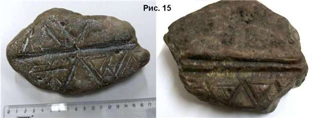 Судя по чистоте и ёмкости символов, трёхлучевой свастике (а не, скажем, крестообразной), данная информация намного старше известных нам цивилизаций, включая египетскую. Скорее всего, это – матрица, с которой в образовательных или иных целях делались оттиски на глине или подобном материале (например, лучи свастики должны быть "закручены" по часовой стрелке). Этих символов, в виде ленты или геометрической фигуры, могло быть 22. Тогда четыре треугольника на обнаруженном камне – это фрагмент Космогонии (проникновение Духа в Материю, возникновение Вселенной). Если же треугольные символы были заключены в более крупные равносторонние треугольники, то таких фигур было две, а общее число символов – 36+36 (отсюда берут начало 72 гения, 72 ангела, 72 имени Бога, 72 мудреца и т.д.). Заключённые в символах знания настолько древние и сокровенные, что стали тайными слишком давно.
